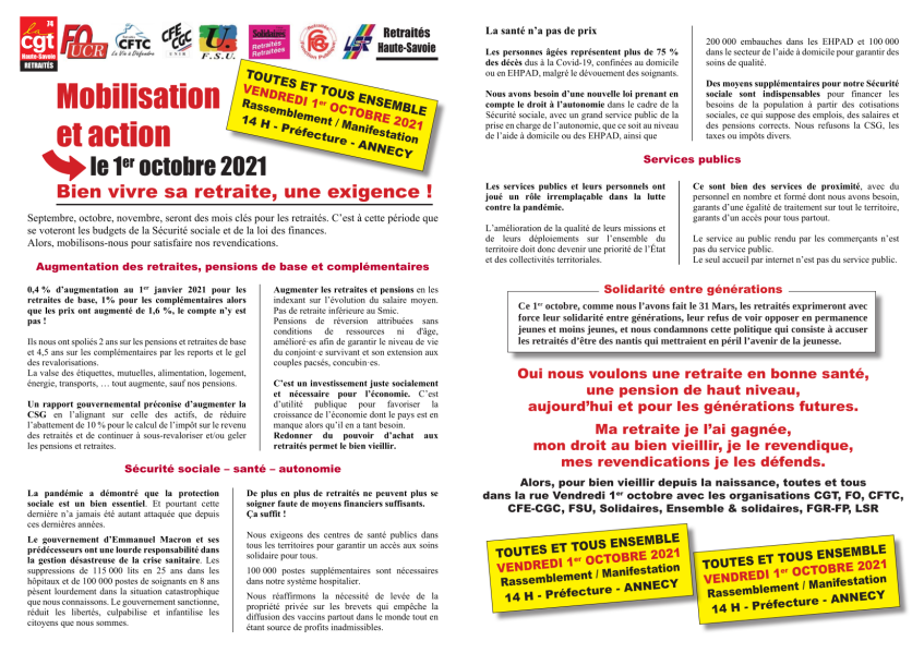 L’intersyndicale des retraités de Haute-Savoie appelle à un Rassemblement/manifestation le vendredi 1er octobre à 14 H à la Préfecture d’Annecy,