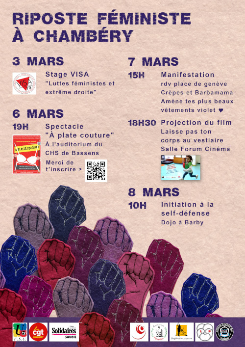 Dans le cadre de la journée internationale de lutte pour les droits des femmes le 8 mars, l’intersyndicale savoyarde FSU - CGT - Solidaires, propose diverses initiatives et actions tout au long de la semaine.