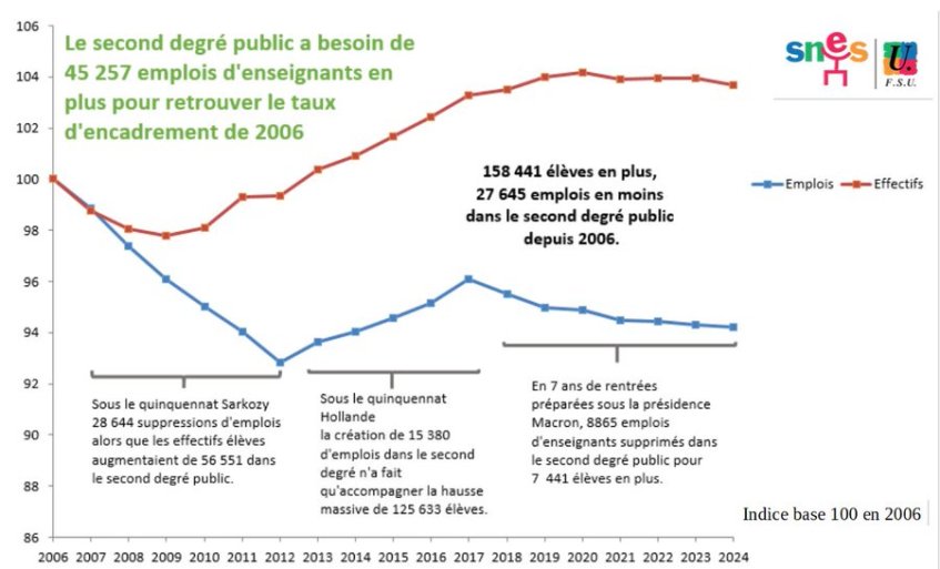 « Garder le cap » pour le gouvernement, c’est donc poursuivre les suppressions de postes et ne prévoir aucune mesure de revalorisation salariale. Dans une Ecole en crise, qui n’arrive pas à recruter et à mettre un professeur devant chaque classe à la rentrée et tout au long de l’année, qui a les classes les plus chargées d’Europe sur le niveau collège, l’annonce du projet de budget est une provocation tout autant qu’une décision irresponsable qui sacrifie l’avenir. Non seulement l’École continue de subir les effets d’une grave crise du recrutement que les pseudo revalorisations - inférieures à l’inflation - n’ont pas réglé (encore plus de 1000 postes n’ont pas été pourvus dans le 2d degré cette année), mais il faut aussi compter avec les près de 9000 emplois d’enseignantes supprimés dans les collèges et lycées publics depuis 7 ans alors que le nombre d’élèves augmentait. L’argument de la baisse démographique n’est pas recevable puisque, que les effectifs augmentent ou qu’ils baissent, on supprime des postes de toute façon. Si l’on remonte à 2006, ce sont 27 600 emplois en moins pour 158 000 élèves en plus ! En revanche, le gouvernement fait le choix de préserver le SNU, gadget coûteux et révélateur de la volonté de mettre la jeunesse au pas. Des millions, voire des milliards pour le SNU, pour les uniformes, pour le Pacte (qui n’est pas de la revalorisation) et des suppressions de postes d’enseignants, les choix sont clairs !