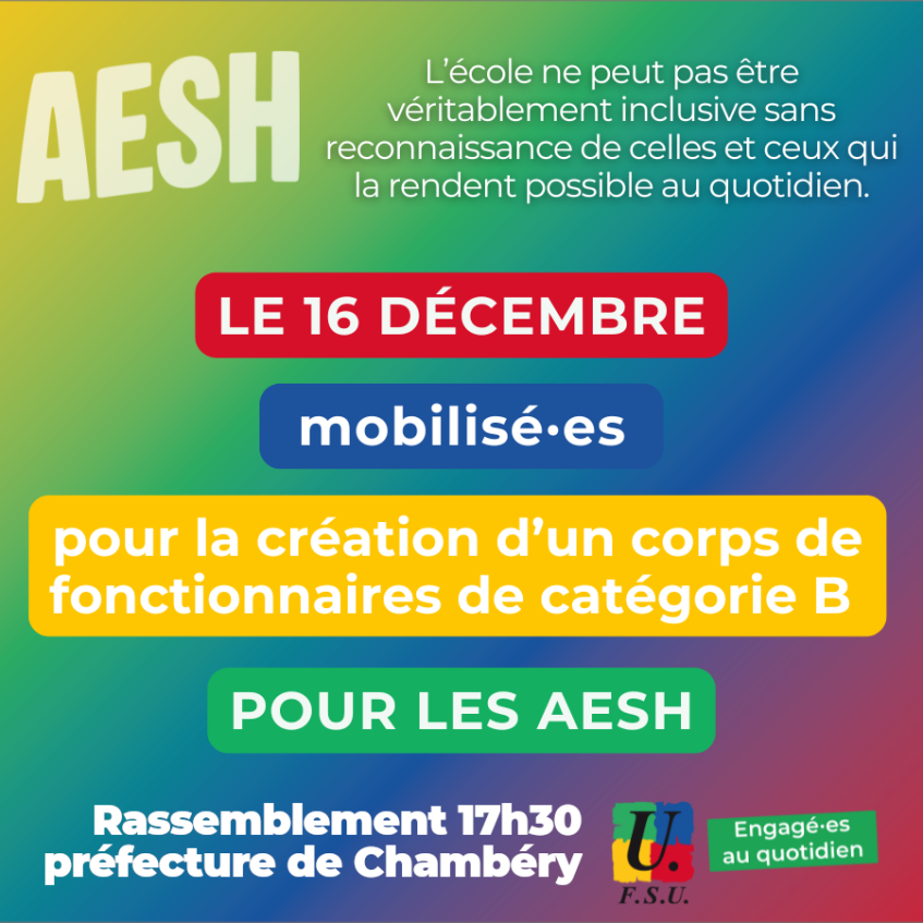 Une conférence de presse est organisée par la FSU73 à 15h (FSU-SNUipp, SNES-FSU), et nous invitons les collègues AESH, et les enseignantes d’ULIS à venir témoigner de leurs conditions de travail : signalez nous votre intention si vous voulez vous exprimer en nous écrivant à s2.73@grenoble.snes.edu
