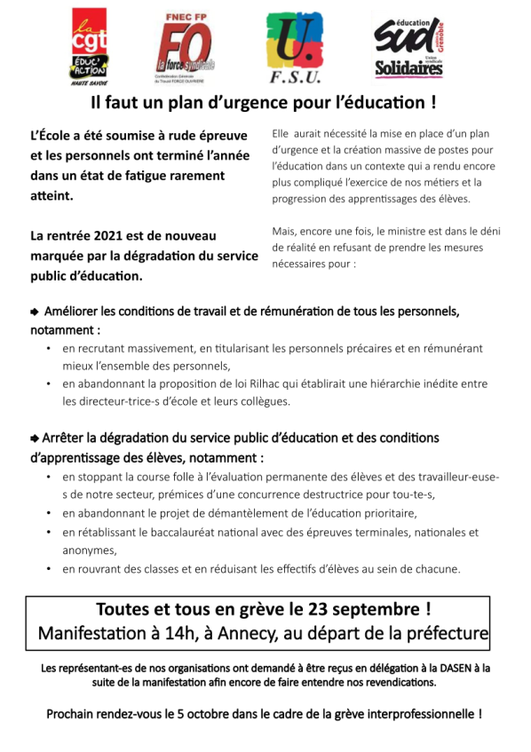 Nous vous donnons rendez-vous le 23 septembre à 14h devant la préfecture d’Annecy, pour défendre l’Education Nationale et ses personnels ; nous réclamons des rémunérations et des conditions de travail dignes de notre engagement pour un service public de qualité dans une République indivisible ( voir tract ci-joint à afficher et à diffuser ).