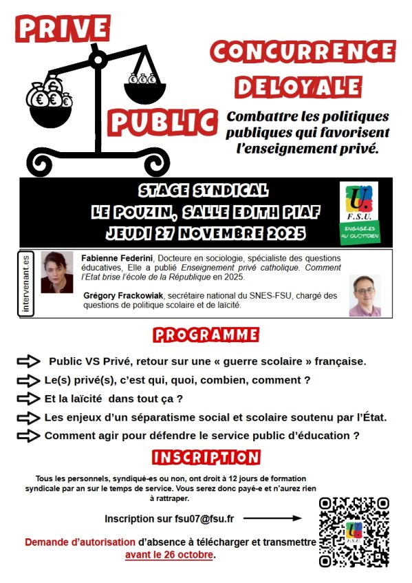 La FSU 07 organise un stage « Public/privé : concurrence déloyale » à la salle Edith Piaf au Pouzin.