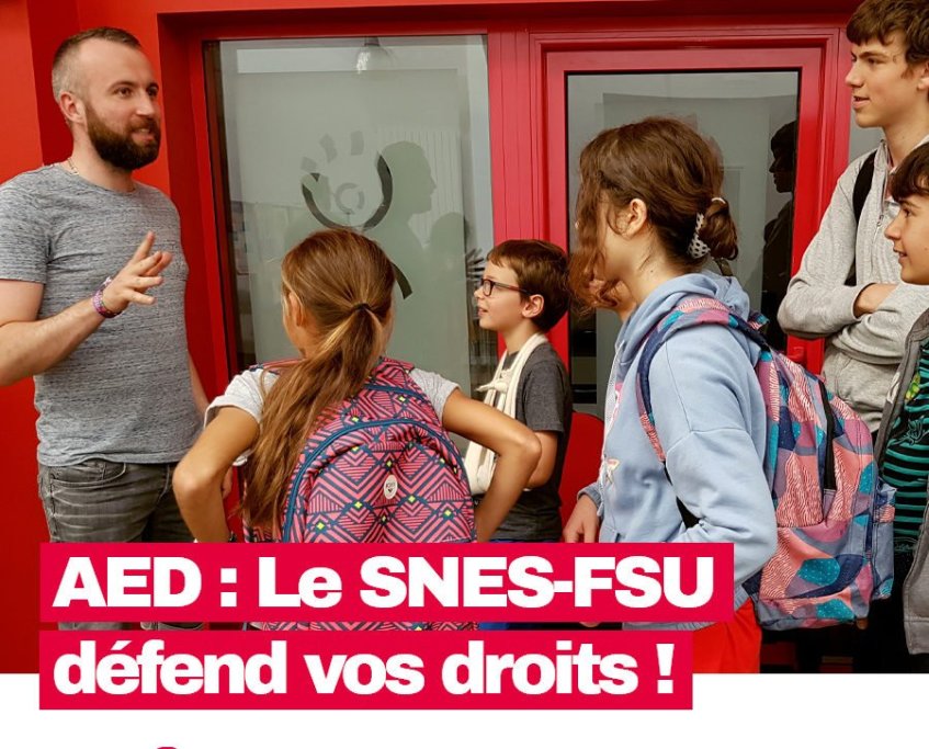 le, AESH) peuvent consulter un livret d’accueil, rien n’existe pour les AED : aucune information par leur employeur sur leurs droits, sur l’action sociale, les règles en cas d’arrêt maladie…Le SNES-FSU demande depuis la parution du décret sur la CDIsation que des règles claires soient définies afin de garantir les droits des AED. Il sera particulièrement vigilant sur l’écriture de ce cadre de gestion et œuvrera pour l’ouverture des droits des AED à la formation, à une amélioration des conditions de travail, à la fin des pressions hiérarchiques… Il y portera ses revendications pour les AED.