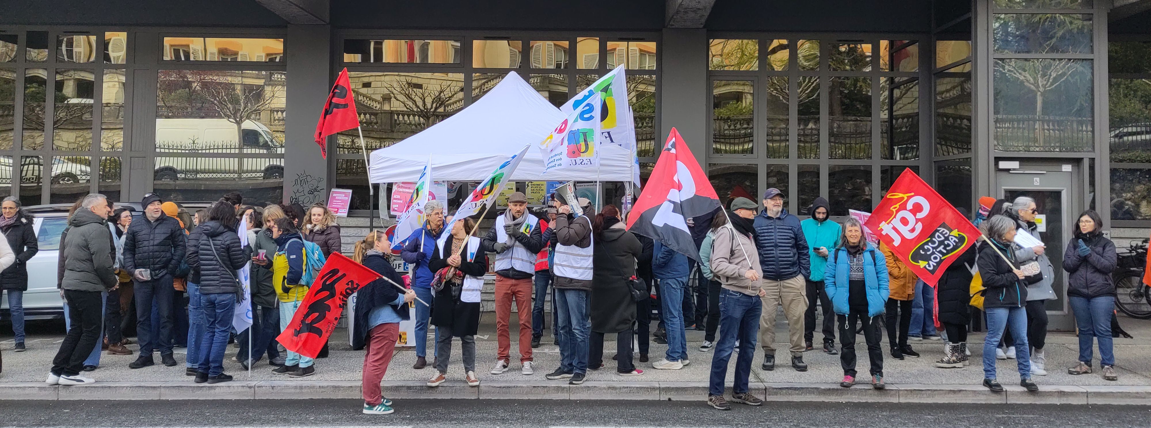 Mobilisation réussie ! 100 personnes au rassemblement devant la DSDEN de Chambéry de 11 à 13h ! La presse était là (France Bleue Ici pays de Savoie et le Dauphiné Libéré), pour ce rassemblement pendant le CSA-SD carte scolaire 1er degré. Soutien des automobilistes qui ont klaxonné en passant, slogans, ambiance revendicative ! Professeures des écoles, professeures du 2d degré, AESH et AED ensemble pour défendre l’école publique, nos salaires, nos métiers !