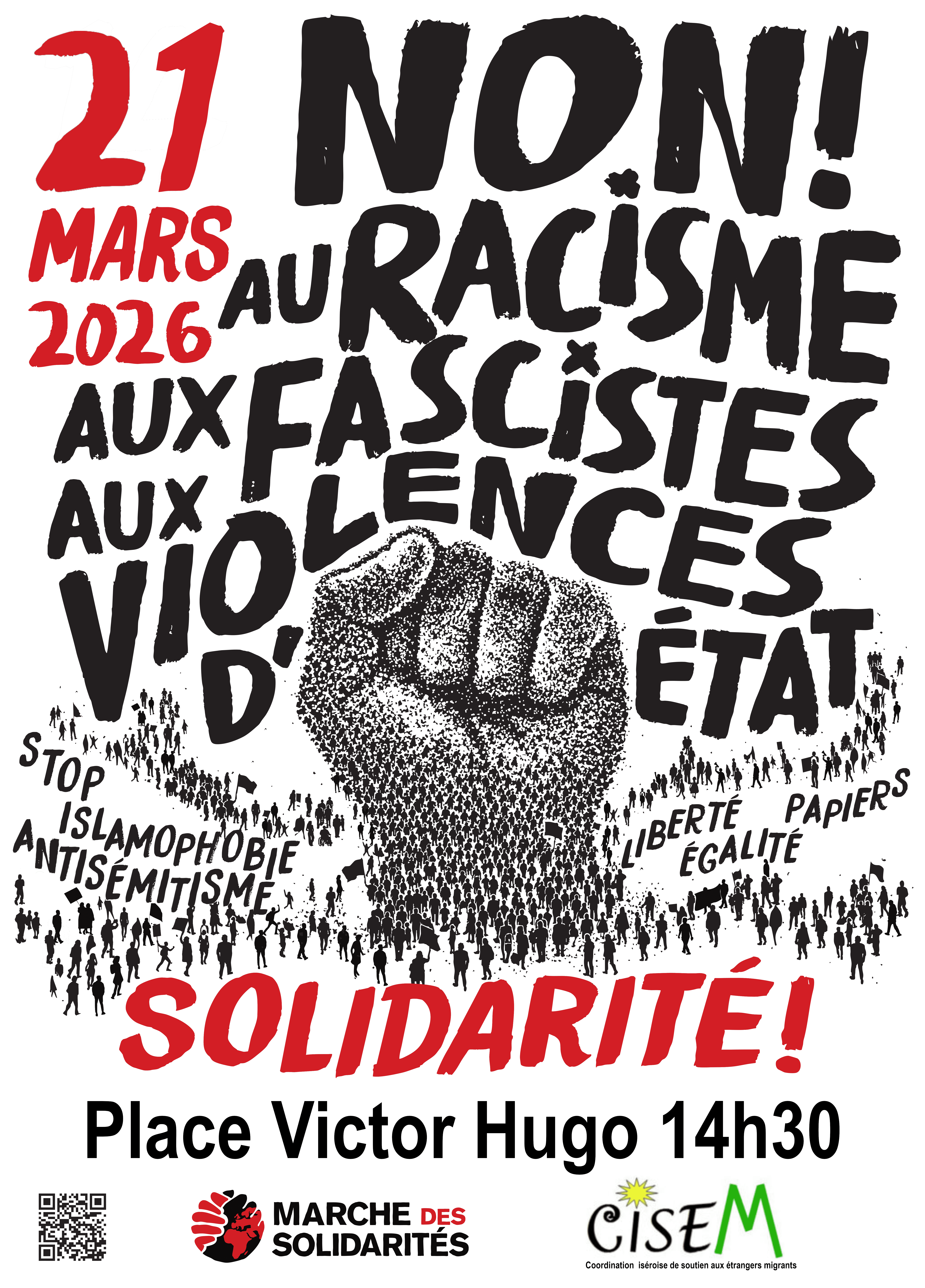 La CISEM (dont la FSU est membre) et la Marche des Solidarités appellent à manifester contre le racisme, le fascisme, la violence d’Etat à 14h30 Place Victor Hugo à Grenoble, ce samedi 21 mars date de la Journée internationale pour l’élimination de la discrimination raciale.