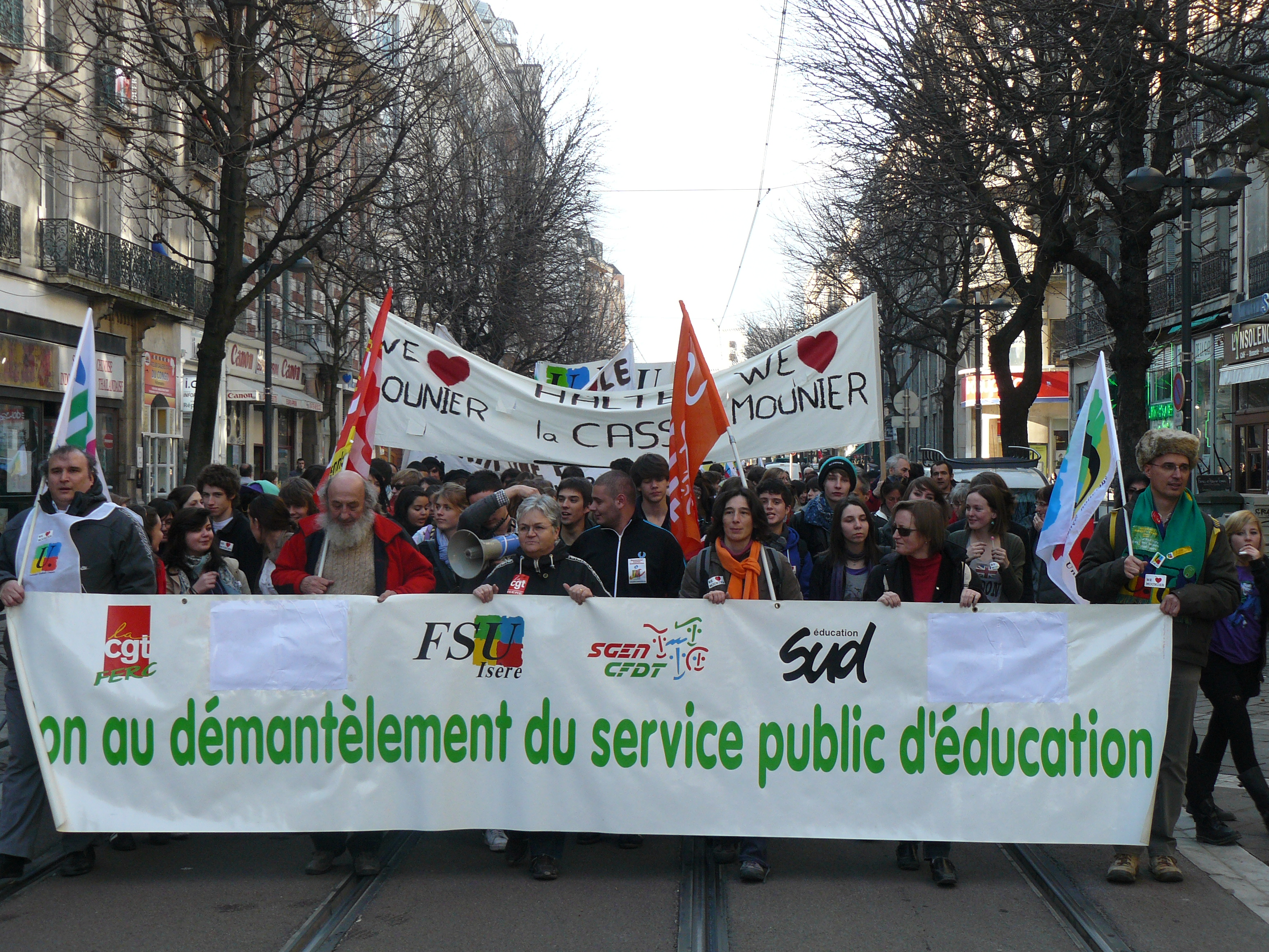 Le jeudi qui suit l’annonce du Recteur est un jour de grève et de manifestations pour l’Education et contre la politique de casse incarnée par Luc Châtel, le ministre de l’éducation de Fillon et Sarkozy. Les « Mounier » restent mobilisés, comme en témoigne leur présence en tête de cortège, derrière la banderole de tête.